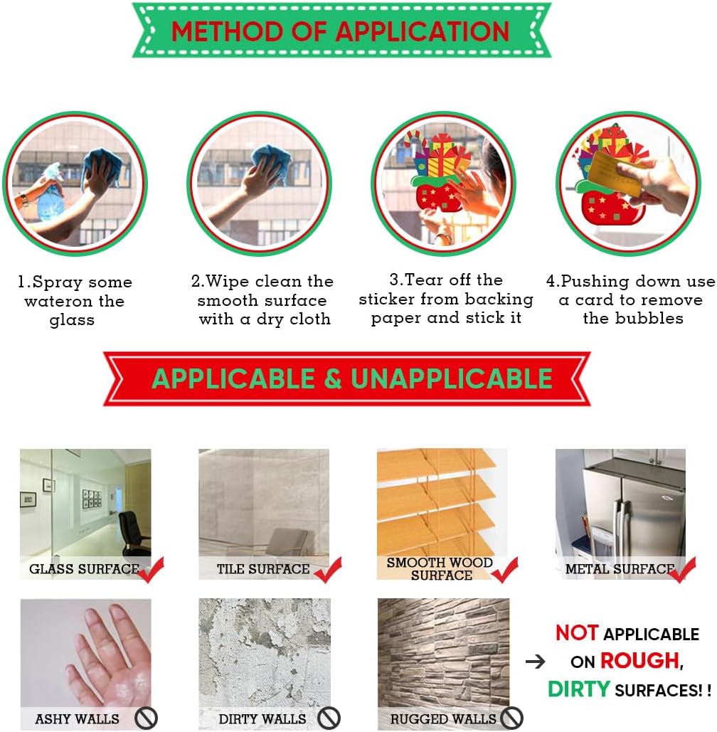 ● Xmas window clings made of premium PVC materials, fit for most smooth surface like glass, mirror, windows, glass storm door and refrigerator.